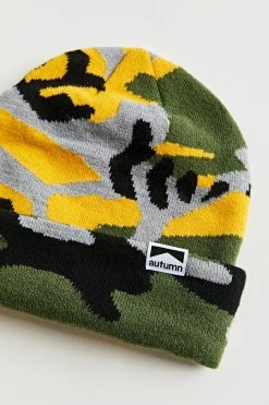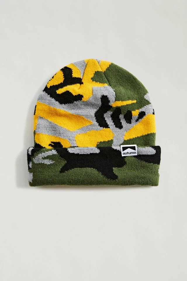 Camo pattern beanie by Autumn. Foldover cuff style with a woven logo label.