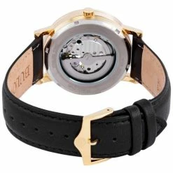 Gold-tone stainless steel case with a black leather strap. Fixed gold-tone bezel. Black (skeletal window) dial with gold-tone hands and index hour markers