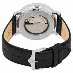 Stainless steel case with a black leather strap. Fixed stainless steel bezel. Black dial with silver-tone hands and index hour markers.
