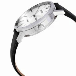 Stainless steel case with a black leather strap. Fixed stainless steel bezel. Silver-tone dial with silver-tone hands and index hour markers.