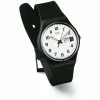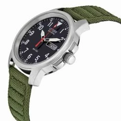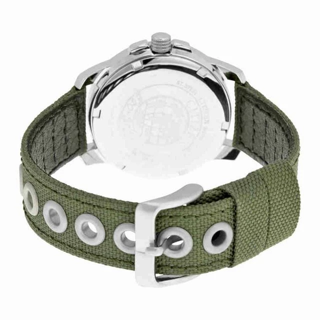 Black dial enhanced by luminous silver-tone hands. Silver-tone brushed stainless steel case with a green canvas band. Eco-Drive movement