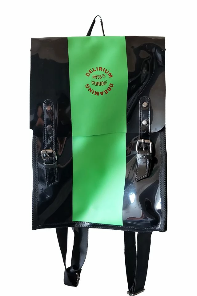 This green and black PVC backpack can hold a MacBook along with many other things such as your wallet, iPad and pencils. Perfect for sport or leisure, this backpack is very comfortable and appealing to the eye.