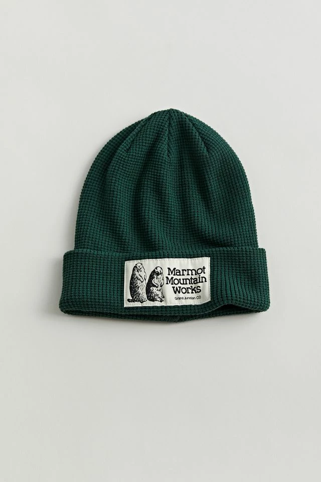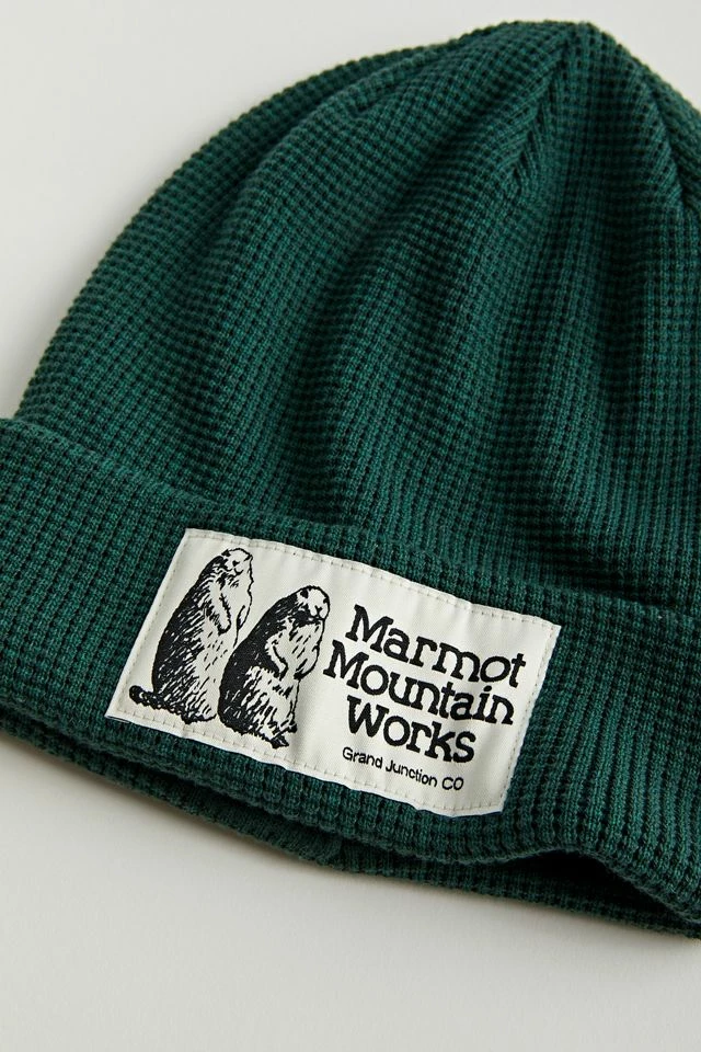 Ribbed knit beanie by Marmot with a foldover brim and finished with a patch at the front.