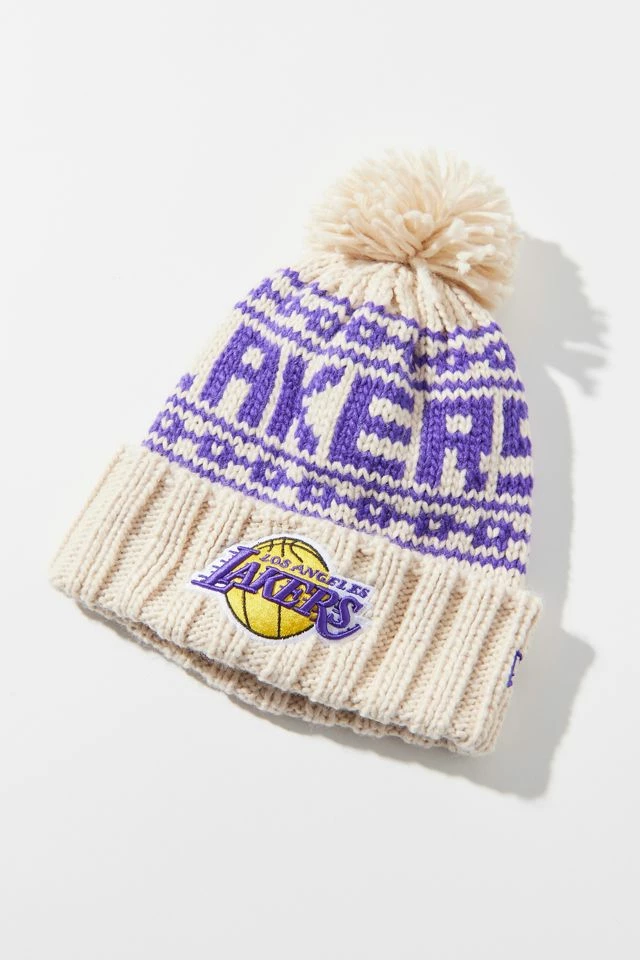 Knit with vintage-style NBA graphics, this ultra-cozy beanie hat from New Era is topped with a fluffy pompom. Finished with a ribbed cuff.