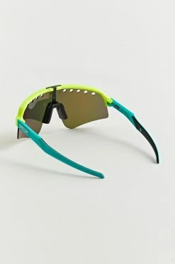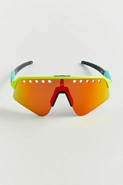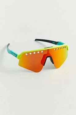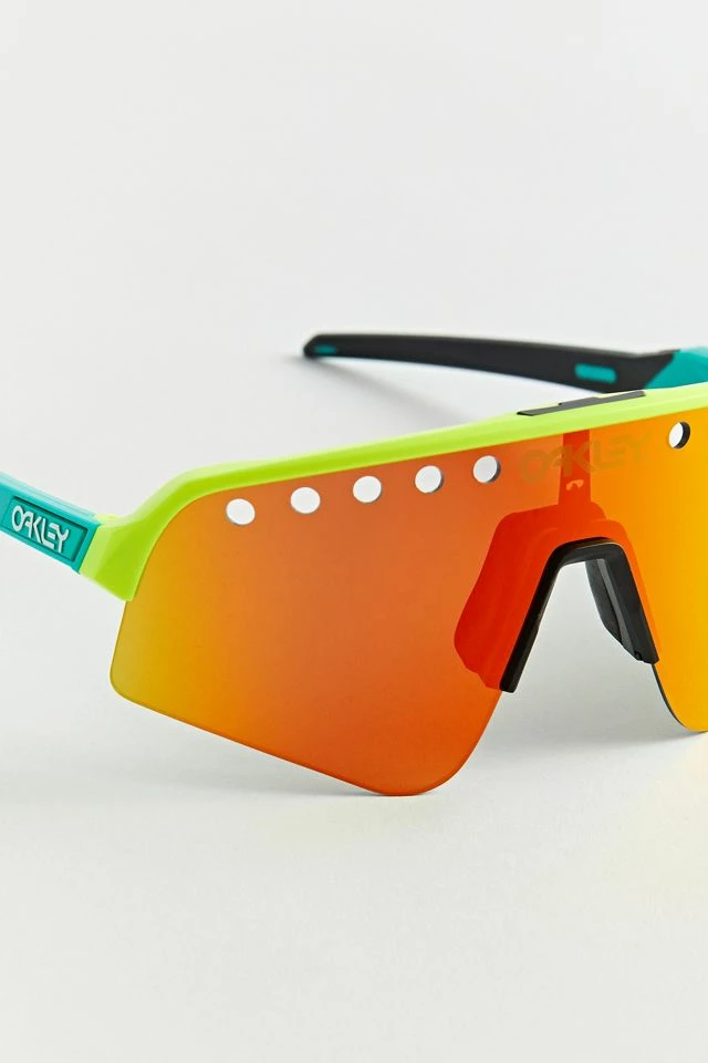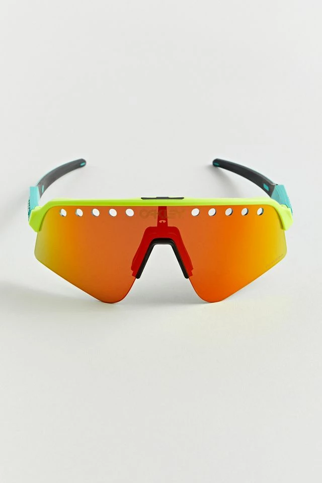 Colorful sunglasses by Oakley in a retro shield style with a perforated lens. Fitted with padding at the nose bridge.