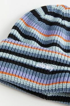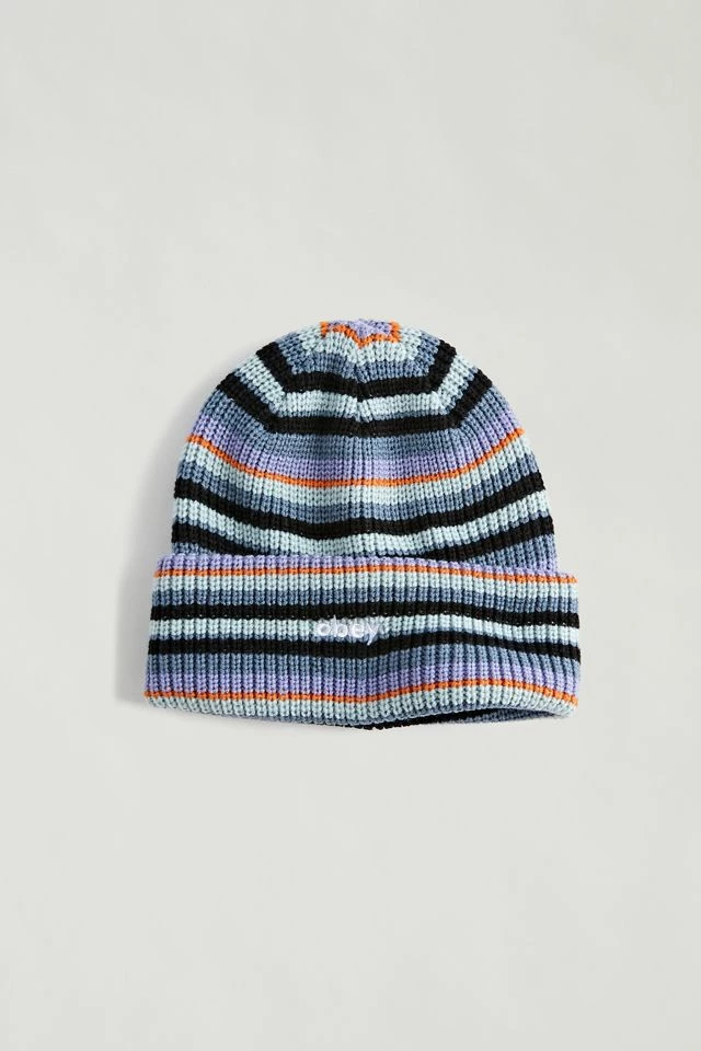 Ribbed knit beanie by OBEY with an allover stripe pattern. Foldover cuff style & topped with logo text embroidery.