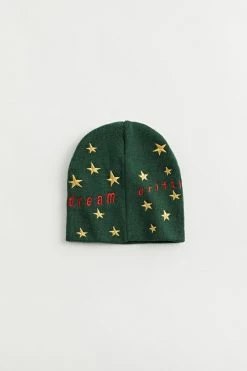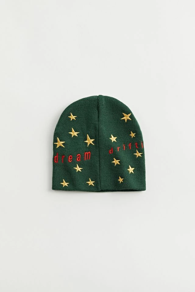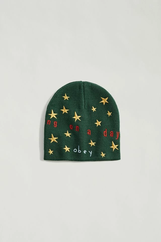 Allover embroidered text and star beanie by OBEY. Acrylic knit fabrication.