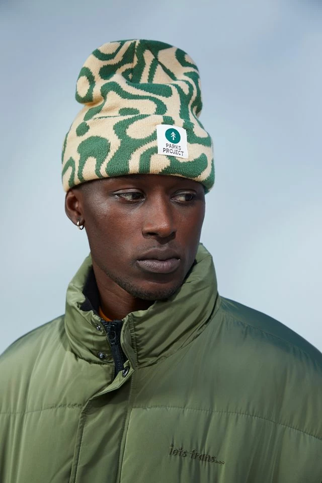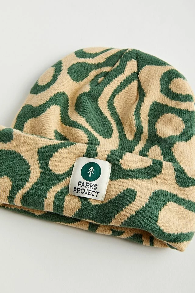 Knit beanie from Parks Project with an allover pattern. Features a foldover cuff and topped with a logo patch.