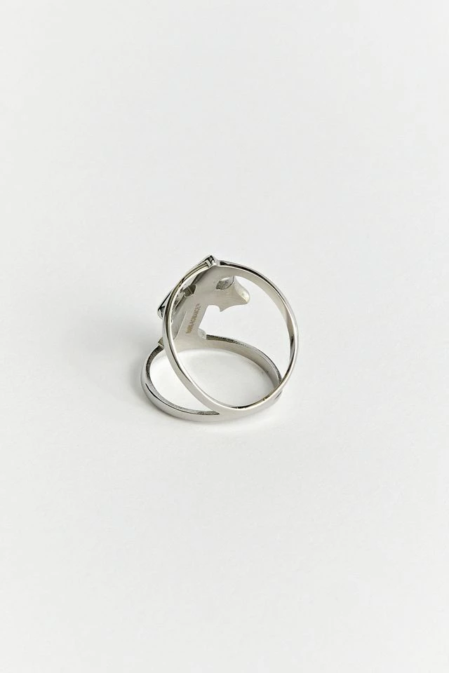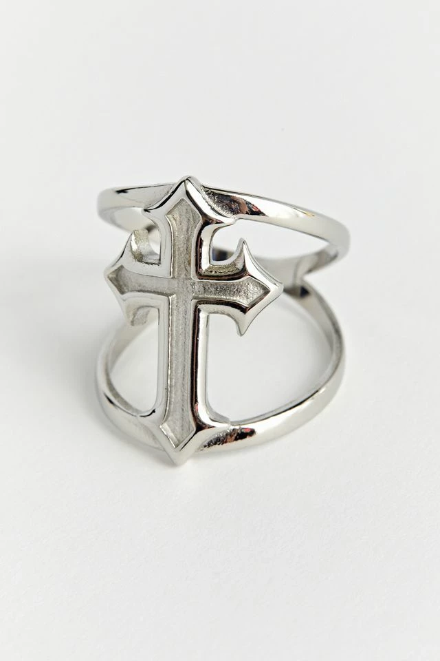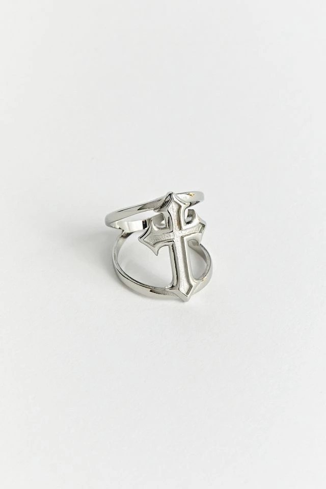 Silver-tone ring by RARE-ROMANCE with a cross motif accent at the top.