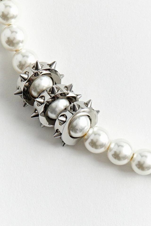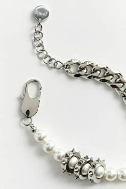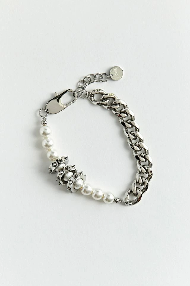Faux pearl and silver-tone chain bracelet by RARE-ROMANCE. Adorned with spike bead detailing. Adjustable length with a lobster clasp closure.
