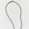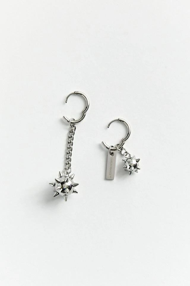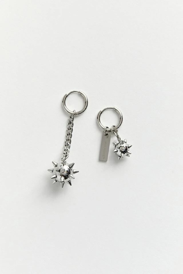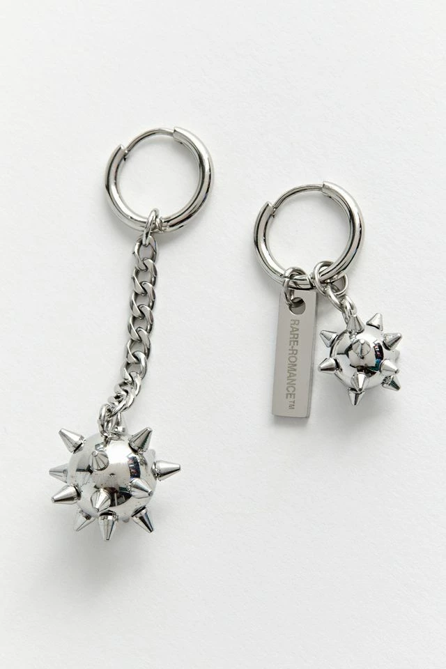 Pair of silver-tone stainless steel earrings by RARE-ROMANCE. Hoop silhouette adorned with spike ball accents with mini chain detailing.
