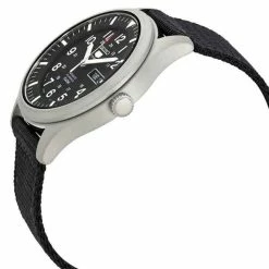 Stainless steel case with a black / blue nylon strap. Fixed silver-tone stainless steel bezel. Black dial with luminous hands and Arabic numeral hour markers