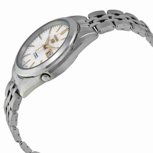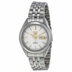Stainless steel case with a stainless steel bracelet. Fixed stainless steel bezel. Silver dial with luminous gold-tone hands and index hour markers.