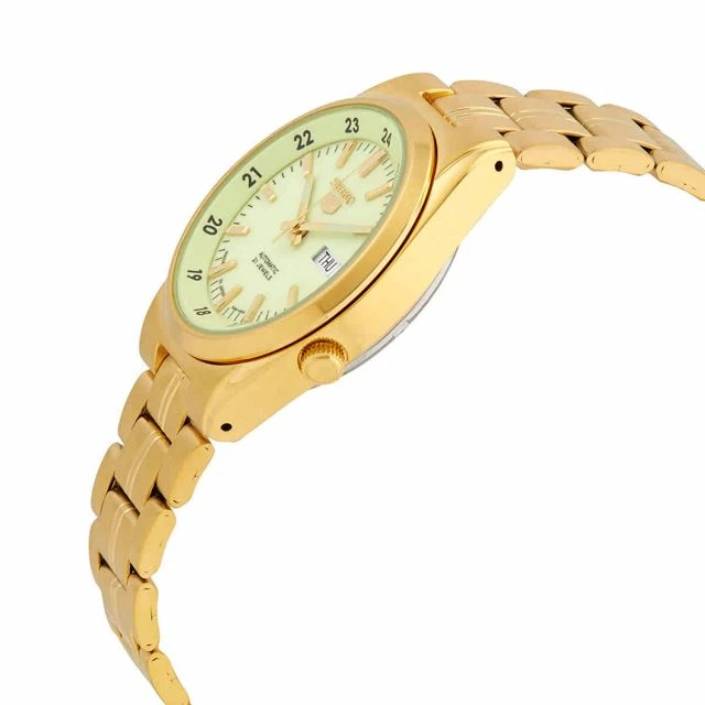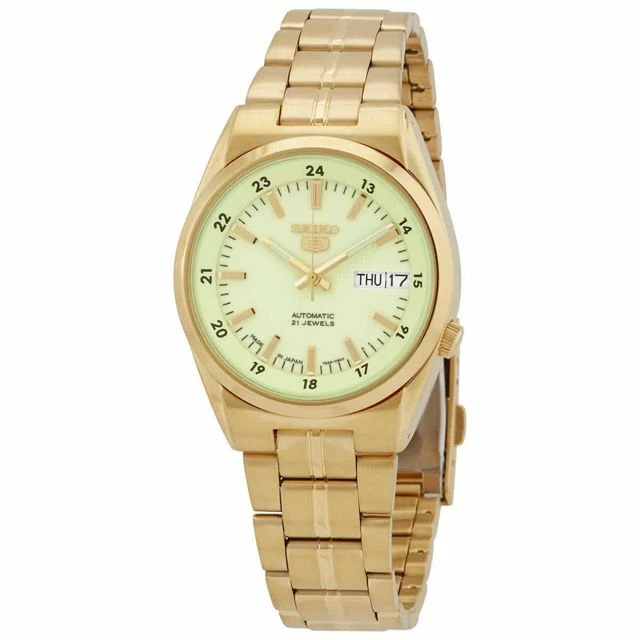 Champagne dial enhanced by luminous gold-tone hands. Gold-tone stainless steel case with a gold-tone stainless steel band. Automatic movement