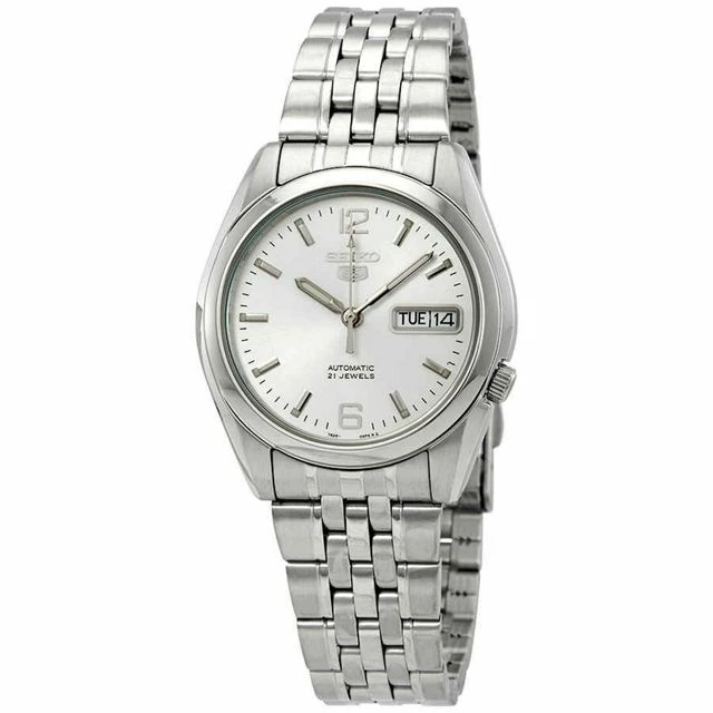 Stainless steel case with a stainless steel bracelet. Fixed stainless steel bezel. White dial with luminous silver-tone hands and index hour markers.