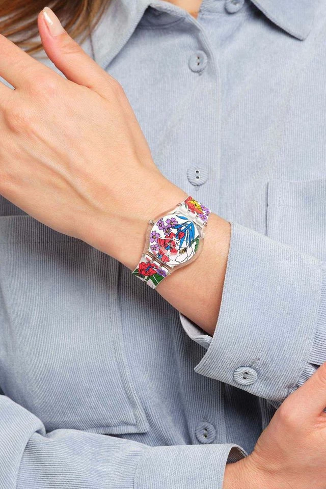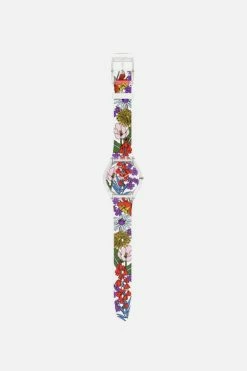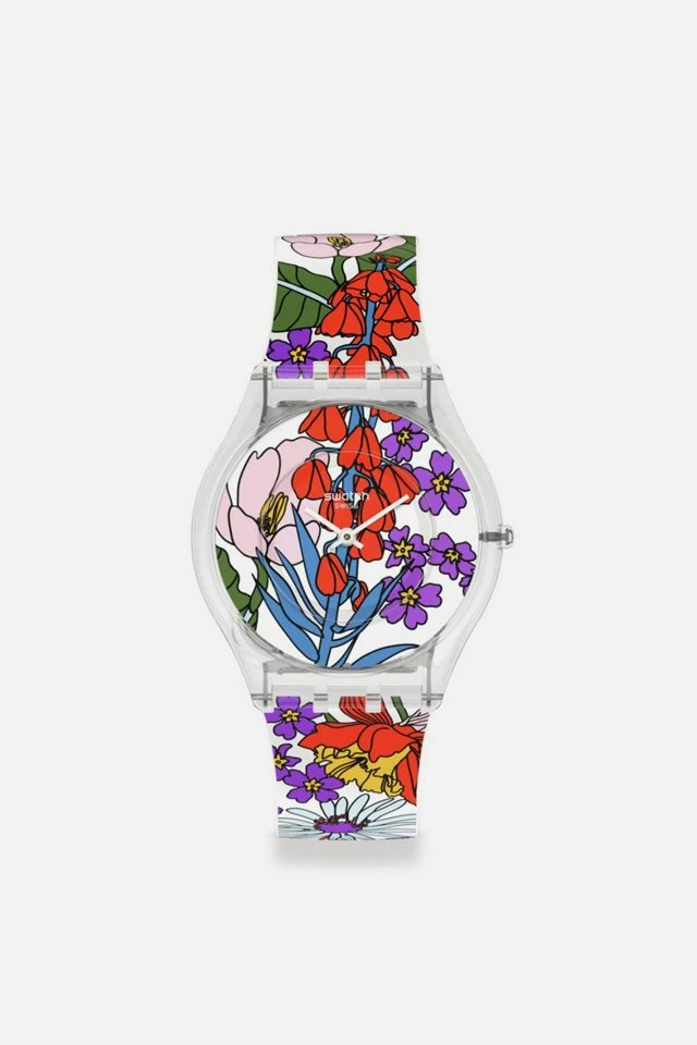 The eye-catching multi-colored flower print steals the show of this SKIN Classic BIOSOURCED watch. This floral watch features a multi-colored print dial, solid matte silicone strap and clear transparent polished bio-sourced plastic case.