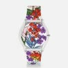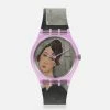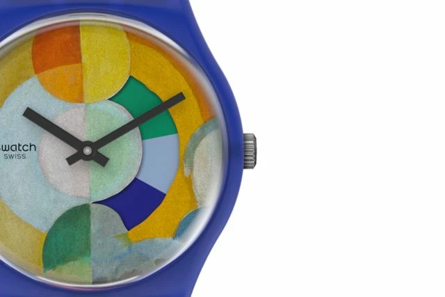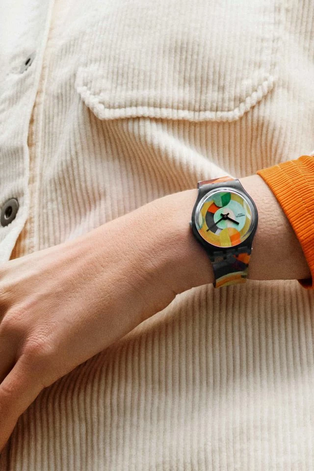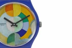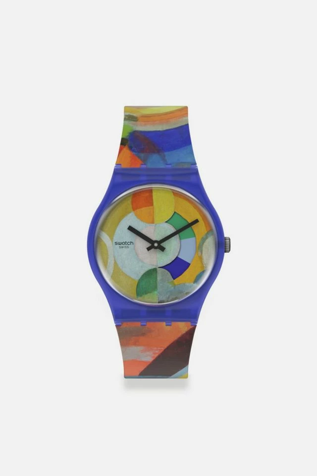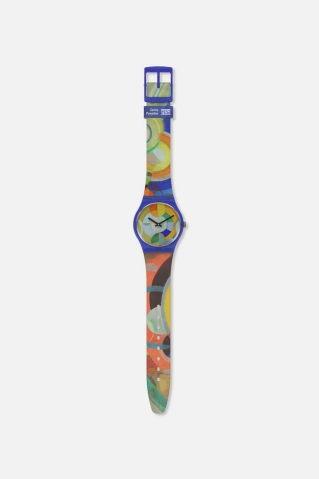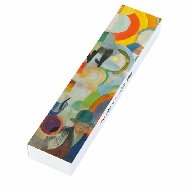 This Swatch art collaboration New Gent watch celebrates icon of color, Robert Delaunay. A multi-colored allover print inspired by his work, ‘The Carousel’, covers the semi-transparent matte blue silicone strap and transparent dial. A calendar wheel on the dial that changes color brings a touch of Swatch personality to this Swatch museum collaboration watch. On close inspection, dancers’ dresses can be seen on this Swatch X Centre Pompidou Collection watch.