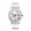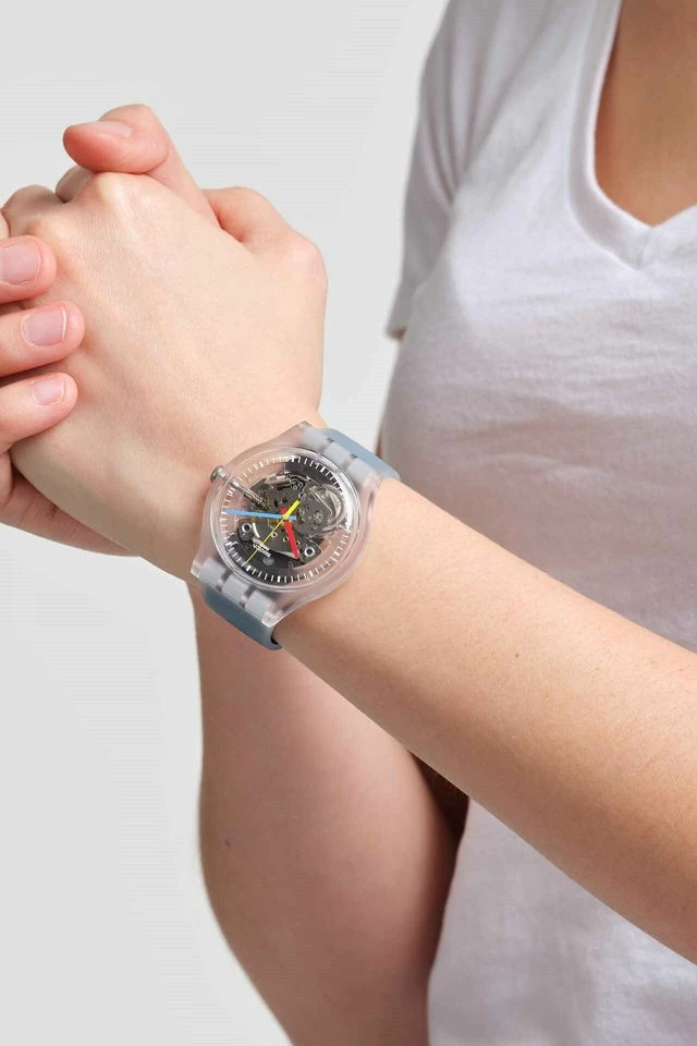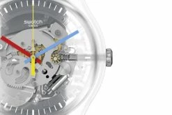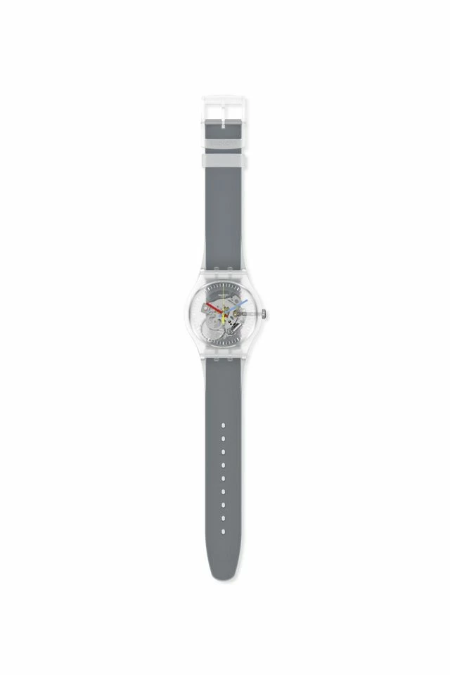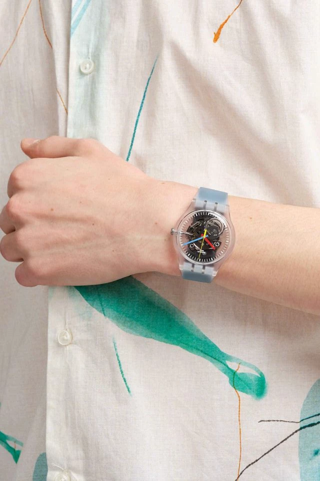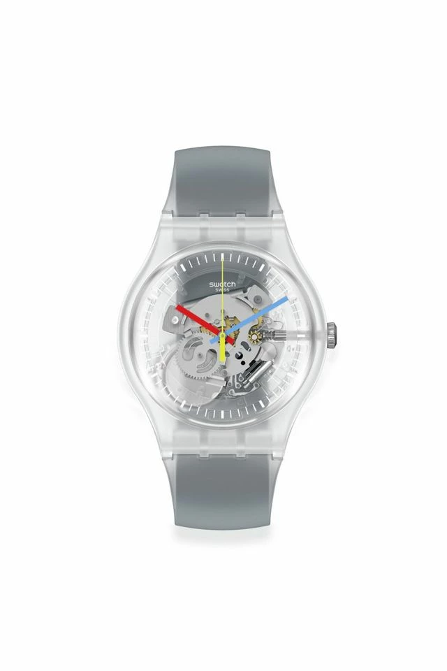 This transparent watch features a clear plastic case with a back print and a matching silicone strap. The clear dial is printed with white indexes and pops with red, blue and yellow hands.