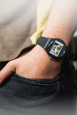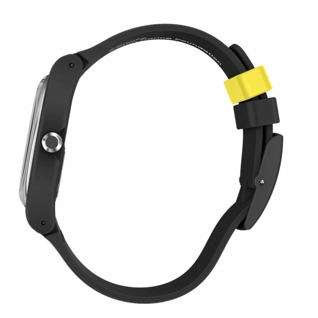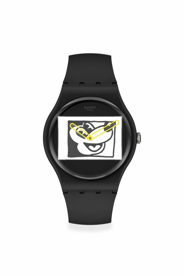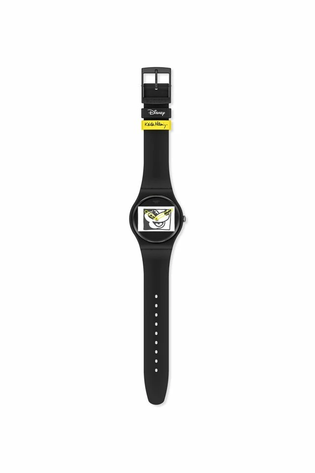 Illustrated by Haring, Disney’s icon happily takes center stage on the dial of Mickey Blanc Sur Noir (SUOZ337). The pop-yellow hands let you see Mickey Mouse through time and, together with the flashy loop, add the fun to the minimalist monochrome design.