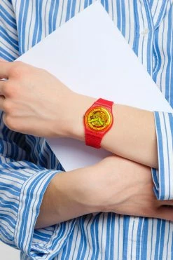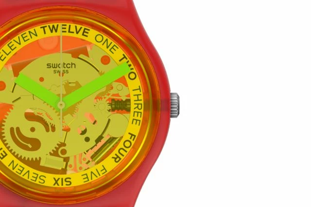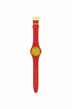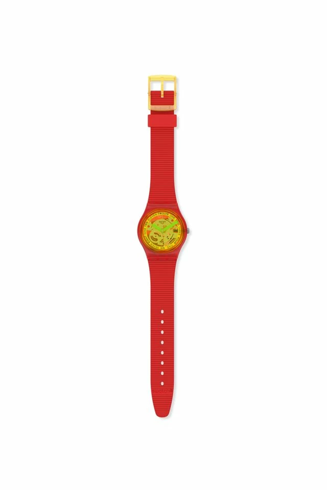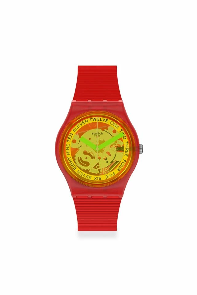Swatch the vibe! Intense RETRO-ROSSO (GR185) is full of ticking details to enjoy through an out of this world fluo yellow screen. It caters to the bold, with devilish details and a ribbed strap reminiscent of iconic ’80s textures.