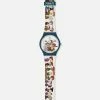 Bio-sourced beauty: this BIOCERAMIC watch juxtaposes a solid matte white strap, loop, buckle & case against a grey dial with a multicolored print.