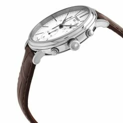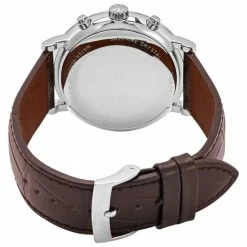 White dial enhanced by black leaf-style shape hands. Silver-tone stainless steel case with a brown leather band. Quartz movement
