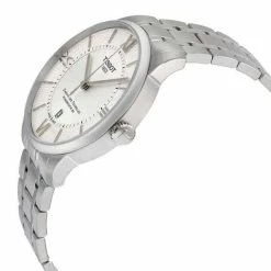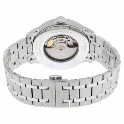 Silver dial enhanced by silver-tone hands. Silver-tone stainless steel case with a silver-tone stainless steel band. Automatic movement