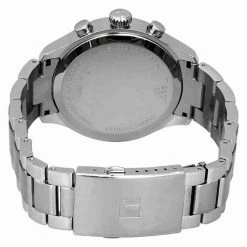 Stainless steel case with a stainless steel bracelet. Fixed stainless steel bezel. Blue dial with luminous silver-tone hands and Arabic numeral hour markers. Minute markers around the outer rim.