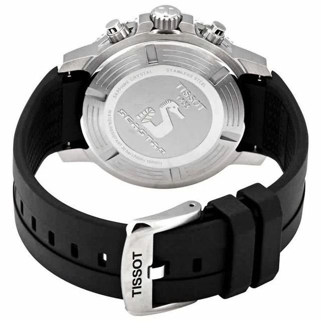 Stainless steel case with a black rubber strap. Uni-directional rotating stainless steel bezel with a black ceramic ring. Blue dial with luminous silver-tone hands and dot hour markers.