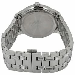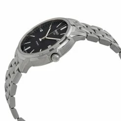 Silver-tone stainless steel case with a silver-tone stainless steel bracelet. Fixed silver-tone stainless steel bezel. Black dial with luminous silver-tone hands and index hour markers.
