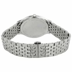 Black dial enhanced by silver-tone alpha-style hands. Silver-tone stainless steel case with a silver-tone stainless steel band. Quartz movement