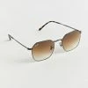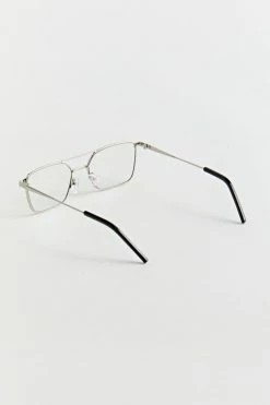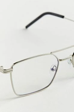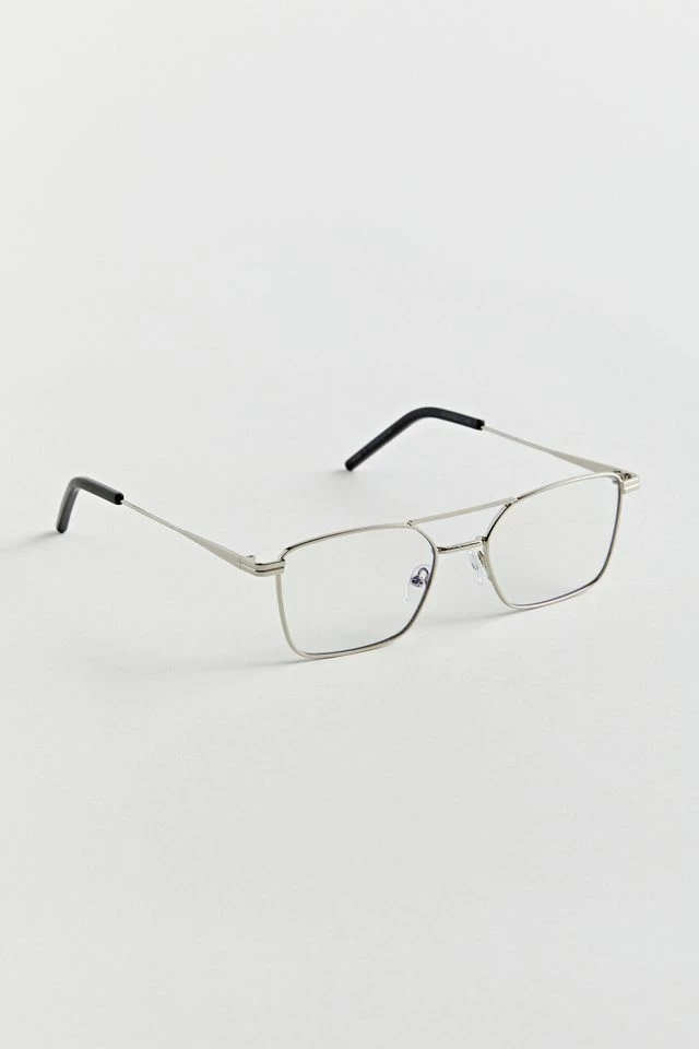 Rectangular aviator silhouette blue light glasses, only at Urban Outfitters. Metal frame style with a brow bar accent and fitted with clear non-prescription lenses.