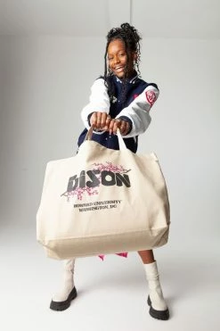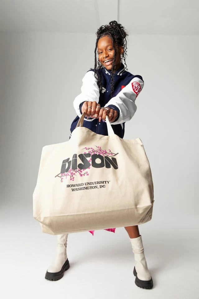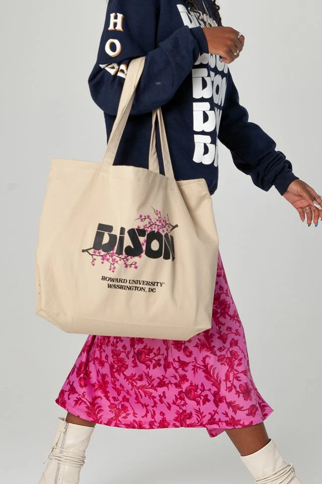 Howard University tote bag from our special-edition UO Summer Class of 2021 HBCU Capsule Collection. The UO Summer Class of 2021 was a 10-week design internship for five students recognized for their academic and creative excellence, in collaboration with three Historically Black Colleges and Universities (HBCUs). From concept to creation, the students designed an exclusive UO capsule collection celebrating the culture and community of their schools. The proceeds from each piece the students created will be donated to their respective schools. Designed by Janae Claxton, this classic cotton tote bag represents DC-based HU with a cherry blossom print and “Black is Beautiful” graphic.